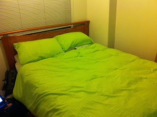 This is a picture of my new bedroom, well only the bed could fit on. It's really very small, but if you want to live in the city centre you have to make the compromise (unless you have lots of money) to downsize. I do have 2 double wardrobes and an en-suite bathroom though, and there's plenty of space under the bed for storage. It's in a really good area, so I can't be too critical.